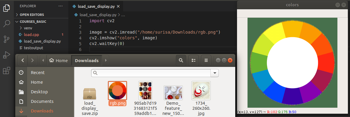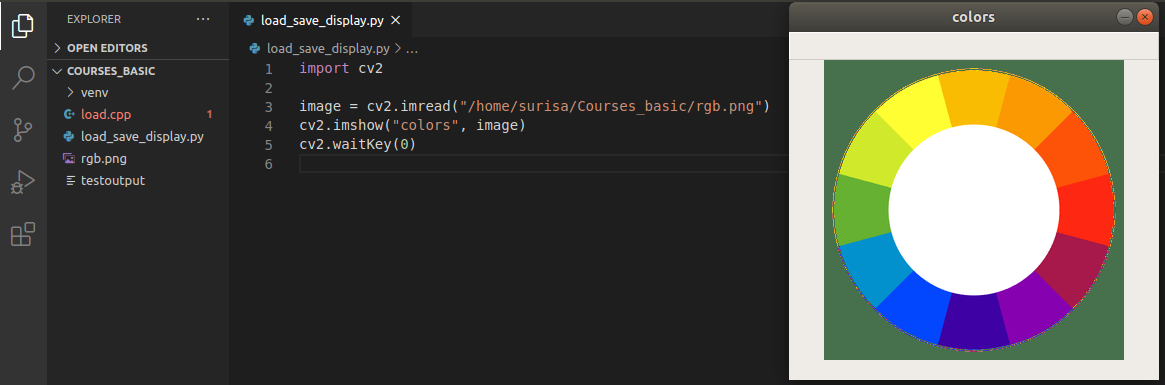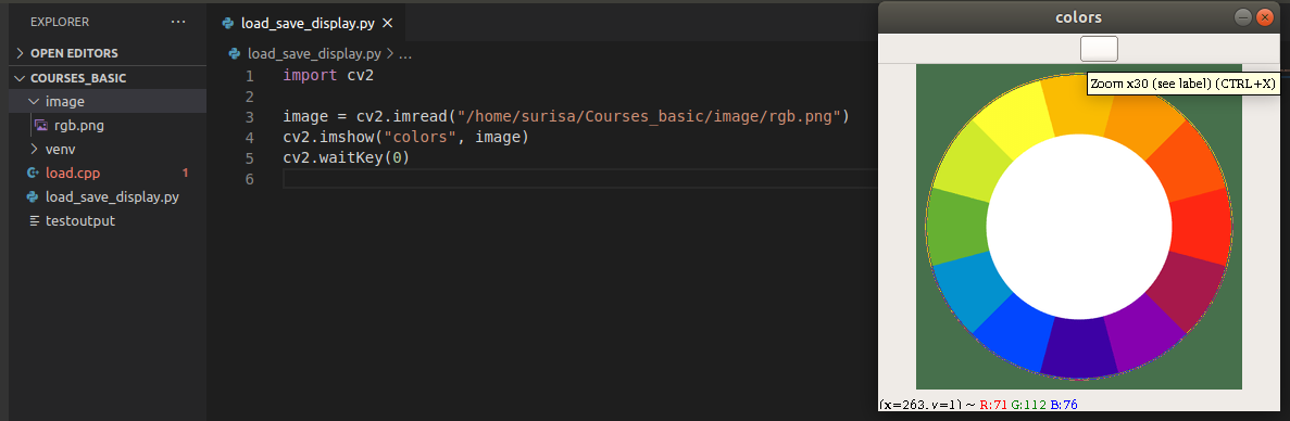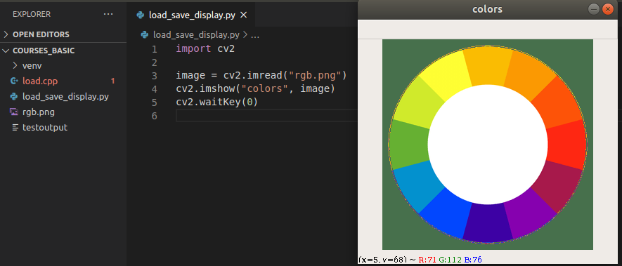 จากภาพตัวอย่างการแสดงภาพบนหน้าจอจะมีอีกฟังก์ชันหนึ่งที่นำมาใช้คู่กันคือ ฟังก์ชัน waitKey() ฟังก์ชันนี้จะทำหน้าที่ในกำหนดการแสดงผล ค่า 0 ที่อยู่ในฟังก์ชันจะหมายความว่ารอรับ input จากคีย์บอร์ด หรือก็คือ เมื่อผู้ใช้ทำการกดปุ่มใดปุ่มหนึ่งบนคีย์บอร์ด จะส่งผลให้ภาพที่แสดงอยู่หายไป หากไม่ต้องการที่จะให้ภาพหายไปด้วยการกดปุ่มบนคีย์บอร์ด ผู้ใช้สามารถตั้งเวลาที่ภาพจะแสดงผลด้วยการกำหนดค่าอื่นแทนค่า 0 ซึ่งค่าที่ใส่แทนค่า 0 จะทำให้แสดงภาพบนหน้าจอตามเวลาที่กำหนดในหน่วยวินาที