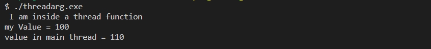 }จากโปรแกรมด้านบน จะเป็นการสร้าง thread และทำการส่งค่าไปให้ thread แระมวลผลโดยค่าที่ส่งไป จะเป็นในลักาณะ pointer เนื่องจากค่าที่อยู่ใน thread เปลี่ยนแปลงค่าที่อยู่ใน main thread ก็เปลี่ยนแลงเช่นกันแม้จะไม่มีการส่งค่ากลับ