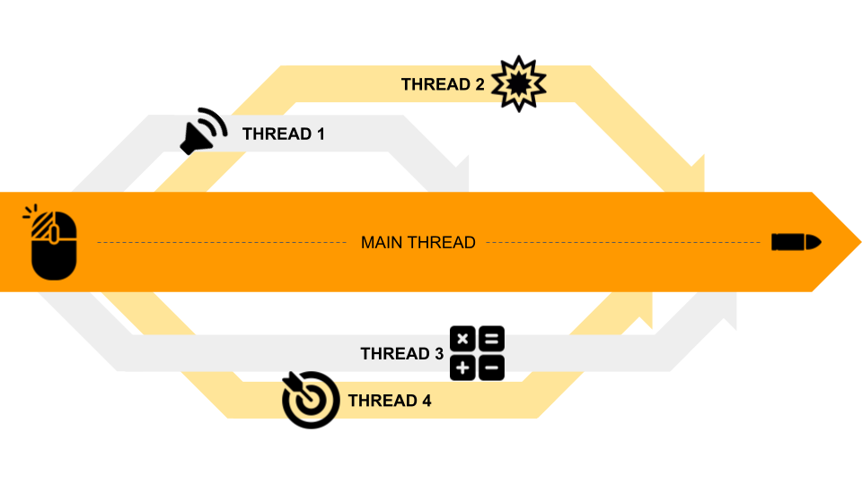 จะเห็นได้ว่าการคลิกครั้งเดียวโปรแกรมจะต้องทำการรันฟังค์ชั่นมากมายในเวลาเดียวกัน ถ้าเราเขียนโปรแกรมแบบ single thread ธรรมดาจะทำให้เกิดความไม่สอดคล้องของภาพและเสียงได้ และยังใช้เวลาในการประมวลผลที่มาก กว่า