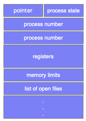 บล็อกควบคุมโปรเซส (Process Control Block : PCB) ระบบปฏิบัติการเอง จะกำหนดเนื้อที่บางส่วนในหน่วยความจำเพื่อทำเป็น PCB ซึ่งเป็นโครงสร้างข้อมูลชนิดหนึ่งซึ่งเก็บข้อมูลที่สำคัญของโปรเซสนั้นๆเอาไว้ข้อมูลเหล่านี้ ได้แก่
