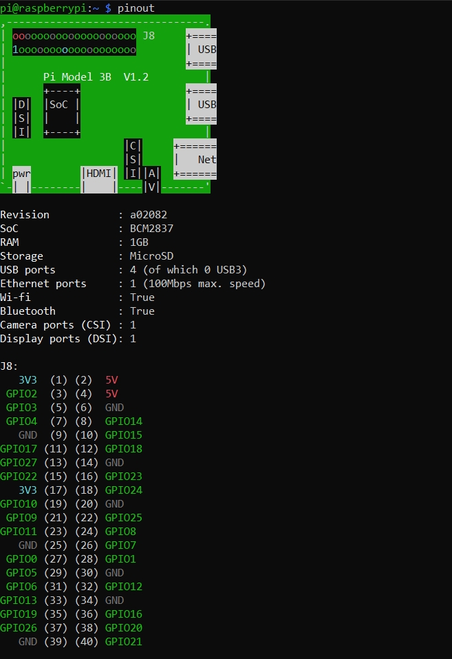สังเกตุจากภาพ pinoutt Raspberry Pi ที่ได้จากคำสั่งด้านล่าง ตัวเลขท้าย GPIO สีเขียว คือเลข GPIO.BCM แต่ตัวในวงเล็บคือเลขของ GPIO.Board ในส่วนของ Raspberry Pi เราสามารถตรวจสอบตำแหน่งและจำนวนของ GPIO โดยให้ทำการ SSH เข้า Raspberry Pi และใช้ Command line ดังนี้