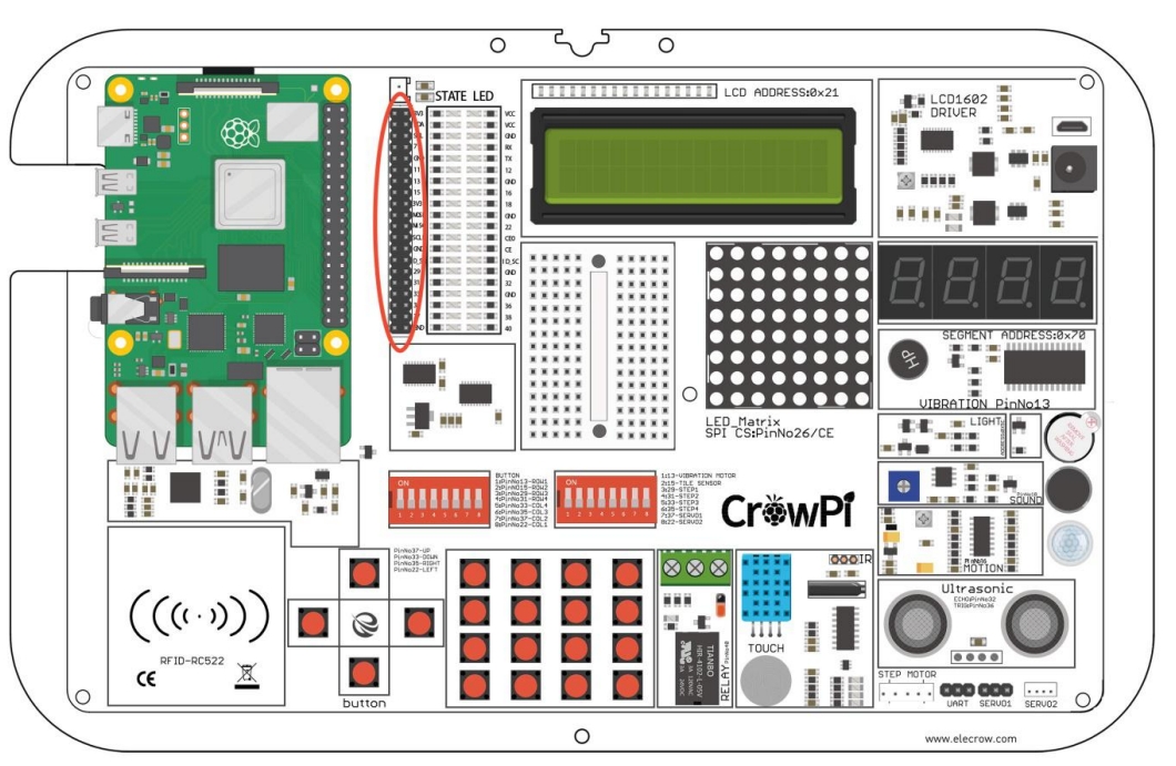 สำหรับ Raspberry Pi สามารถใช้ sensor บนบอร์ด CrowPi ได้โดยเชื่อมต่อ pin ตามตำแหน่ง จะอยู่ตำแหน่งดัง
