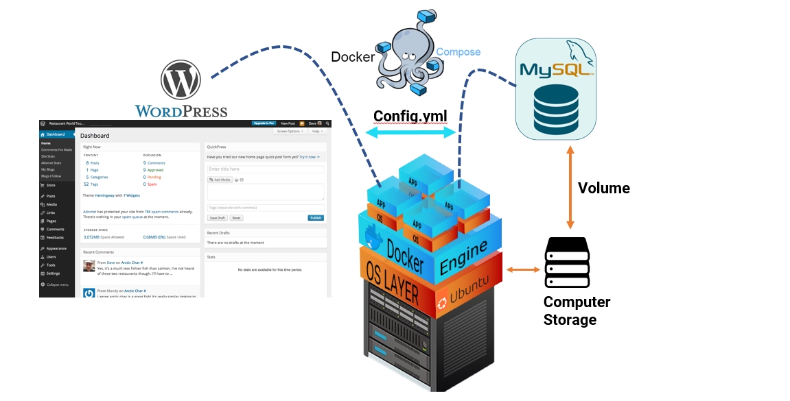 Docker compose นั้นว่าง่ายๆ จะคล้ายๆกับ script คำสั่ง ที่เอาไว้สร้าง container หลายๆอันขึ้นมาพร้อมกัน โดยใช้คำสั่งเดียว ซึ่งปกติเราเวลาจะสร้างเจ้า container จะสร้างจาก image ตัวอย่างเช่น ถ้าจะทดสอบ wordpress เราจะต้องสร้างเจ้า container mysql , container httpd หรือ container nginx หรือ อาจมากกว่านั้นในกรณีที่เป็นโปรเจคอื่นที่ใช้ technology/service เยอะๆ และมันเชื่อมต่อกัน ปัญหาคือเราก็ต้องมาสร้าง container ทีละอัน และทำการ config ทีละอัน อีกที ซึ่งมันจะเสียเวลาอย่างมากเพราะ ปัญหาที่กล่าวมาข้างต้นเลยเกิด docker compose ขึ้นมา คือเราสามารถกำหนดไว้ในไฟล์ docker-compose.yml เลย ว่าใช้ services อะไรบ้าง ตั้งค่าไรบ้าง จากนั้นก็ใช้คำสั่ง run command เจ้า docker-compose โดยใช้คำสั่ง docker-compose up -d แค่บรรทัดเดียว มันก็จะทำการสร้าง container ทุกๆอันให้เราอัตโนมัติ ตามค่า config ที่เราตั้งไว้ ในการใช้งาน docker บางครั้งเราต้องใช้การติดต่อสื่อสารระหว่าง container เพื่อทำการรับส่งข้อมูลในการทำงาน ซึ่งเมื่อเป็นระบบที่ใช้งานจริง จะมี container หลายตัวมาประกอบกันเช่น container จัดการ database, จัดการหน้าเว็บ, จัดการการรับข้อมูลผ่าน sensor ขึ้นไปบนเว็บเป็นต้น เมื่อทำงานพร้อมกันทำให้ต้องคอยควบคุม container หลายตัวพร้อมกันและการทำ docker link และ docker volume จะยุ่งยากในการกำหนดค่าในการทำงาน Docker compose จึงเป็นตัวช่วยในการจัดการงานที่ซับซ้อนให้ง่ายขึ้นโดยการจัดการ container หลายตัวพร้อมกันให้สามารถทำงานร่วมกันได้โดยที่ไม่ต้อง link ให้ยุ่งยาก ซึ่งมักจะทำเป็นตัวจัดการ service ที่จะใช้งานประกอบกัน