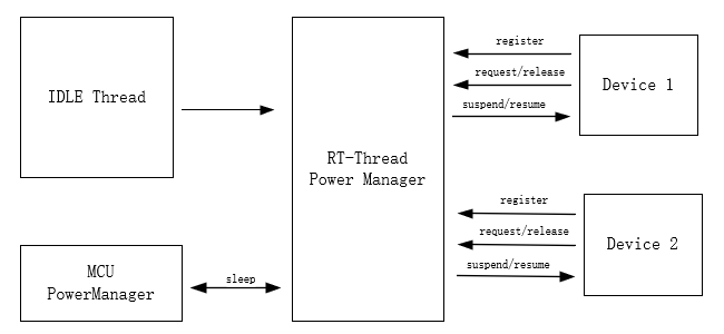 At the beginning of product development, the first consideration is to complete the product function development as soon as possible. After the product functions are gradually improved, it is necessary to add power management (PM) functions. In order to meet the needs of IoT, RT-Thread provides a power management component. The concept of the power management component is to be as transparent as possible, making it easier to add low-power functions to the product.