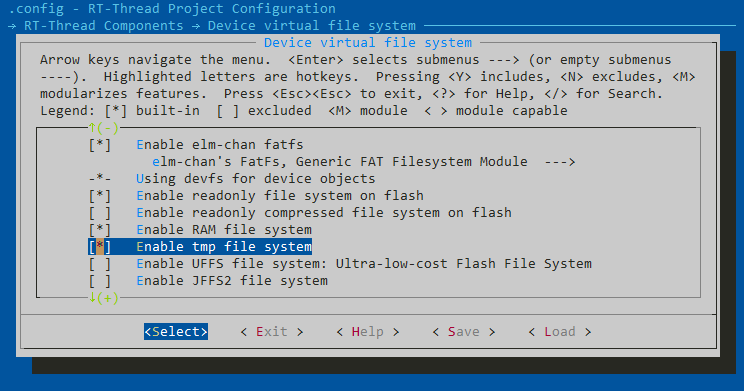 In the rt-smart branch of the rt-thread source code, open the qemu-vexpress-a9 BSP, use menuconfig to configure tmpfs in the component, located in "RT-Thread Components → Device virtual file system", exit and save.