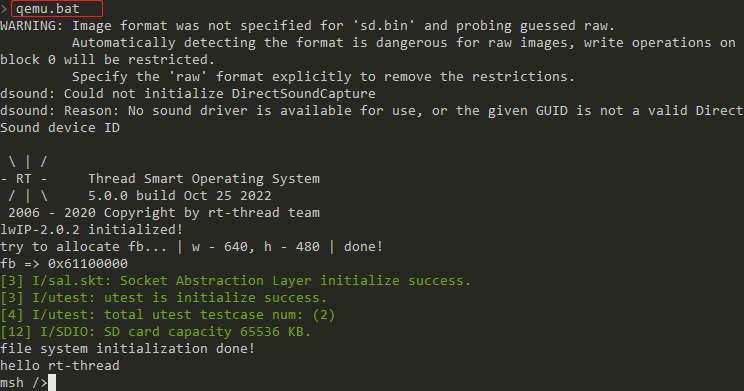 After compiling with the command scons, enter qemu.batto run qemu, switch to the mnt directory and create a tmp directory (if you use fatfs for the first time, you need to format it with mkfs first)
