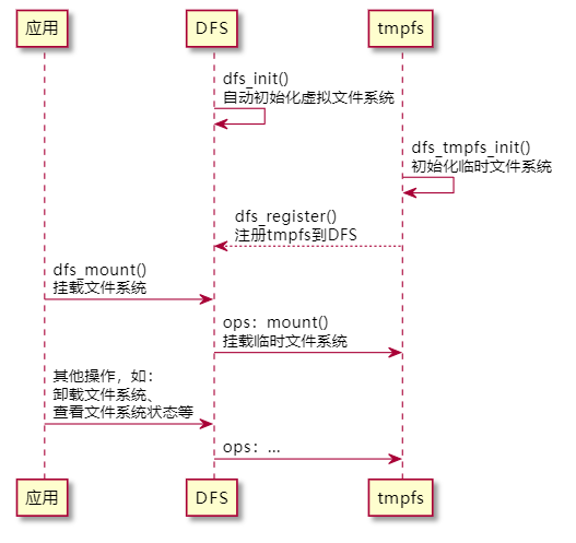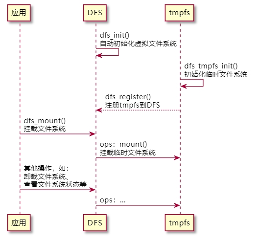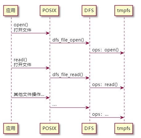 The following is a sequence diagram of the application layer using the DFS virtual file system API to access tmpfs: