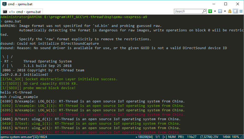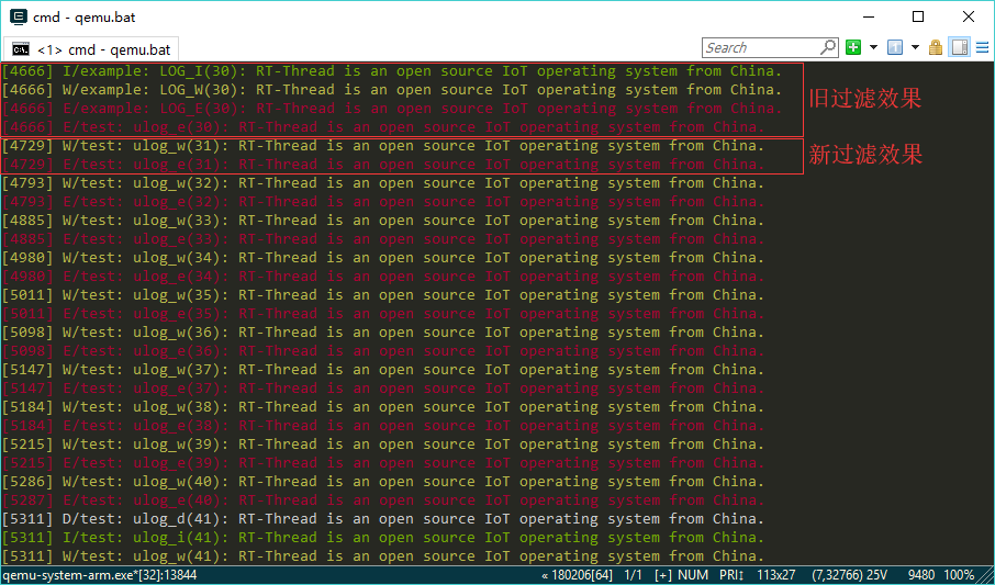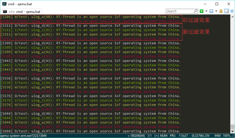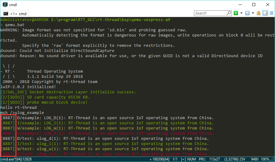 The usage of syslog() function is also very simple, and its input parameter format is the same as printf function. There is also a syslog routine in ulog_example.c, and the running effect in qemu is as follows: