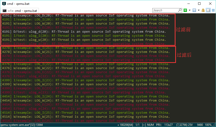 Still executed in qemu BSP, first turn on dynamic filtering in menuconfig, then save the configuration and compile and run the routine. After the log is output about 20 times, the corresponding filtering code in ulog_example.c will be executed: