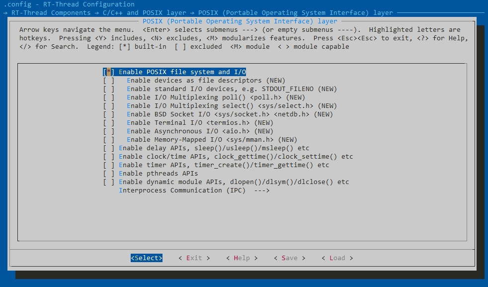 Enable POSIX file system and I/Oto configure the specific POSIX function interfaceEnable required functions as required, such as device I/O, AIO, MMAN, etc.