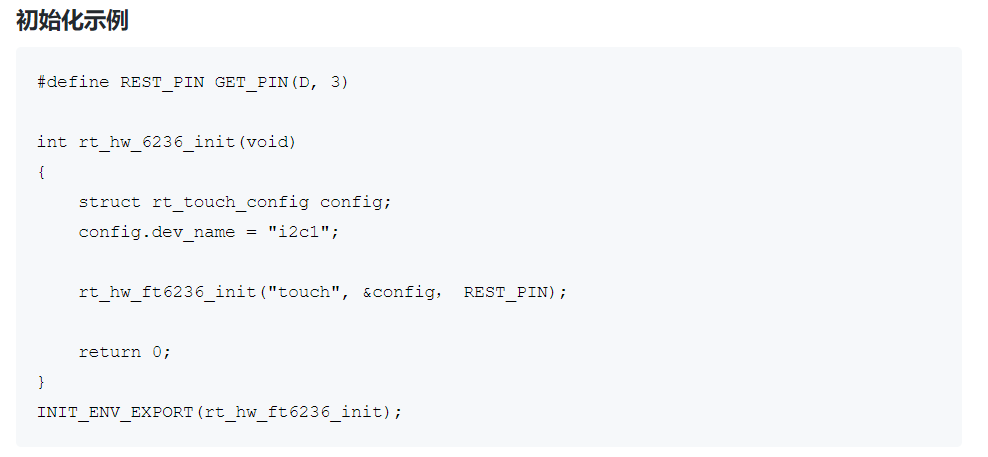 rt_hw_ft6236_init(TOUCH_DEV_NAME, &cfg, BSP_TOUCH_I2C_RESET_PIN); /* 软件包提供的初始化函数 */