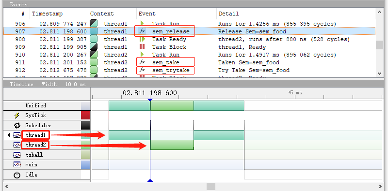 Using the SystemView tool, we can see that the system is running as we expected. Thread 1 starts running first, and then is interrupted by Thread 2 after releasing the semaphore. Thread 2 then runs, and then is suspended because it cannot obtain the semaphore, and Thread 1 continues to run. From the above event list, we can also see the specific time when each thread obtains or releases the semaphore.