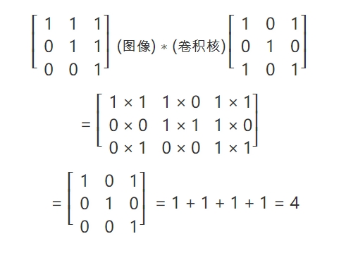 It can be seen that the convolution operation is actually to scan the convolution kernel on the image in rows and columns, multiply the numbers at the corresponding positions, and then sum them. For example, the convolution result 4 in the upper left corner above is calculated like this (here ∗ represents convolution):