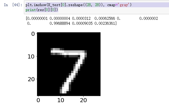 From the 1x10 matrix above, we can see that the 7th number 0.753 is much larger than the other numbers (the subscript starts at 0), so we know that the current prediction result is 7. Therefore, softmax will output 10 numbers as the output layer of the model, each number represents the probability that the image is 0-9, and we take the largest probability as the prediction result .