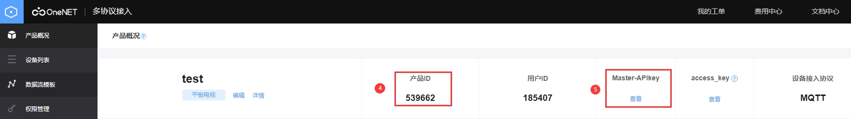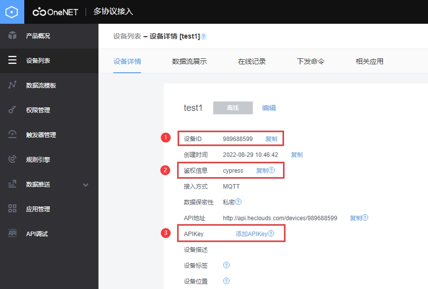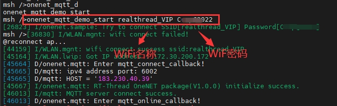 1. Enter the command in msh onenet_mqtt_demo_start 【WI-Fi 名称】 【WI-Fi 密码】to create and start the demo thread