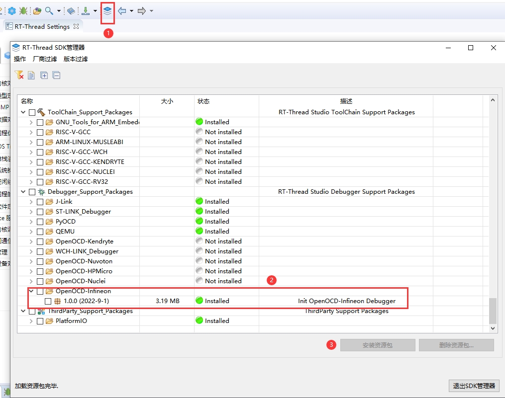 RT-Studiothe SDK manager and download the InfineonOpenOCDresource package.