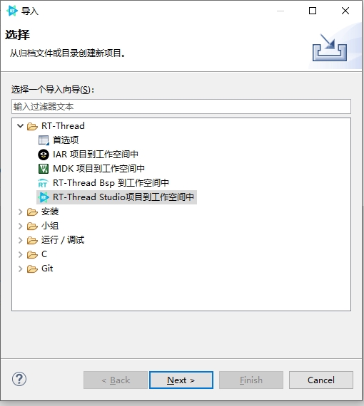 文件—>导入—>RT-Thread Studio项目到工作空间中