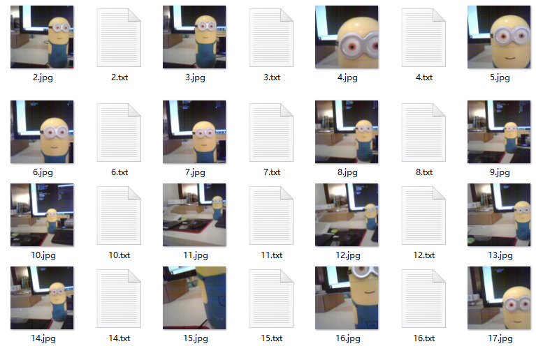 There should be some photos taken here. Each photo corresponds to a txt file indicating the position and size of the Minions. There is also a train.txt and test.txt file that summarizes the file names of the current training set and test set.