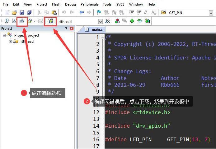 Enter bsp\cypress\psoc6-cy8ckit-062S2-43012the folder, double-click the project.uvprojx file, open the MDK5 project, and compile. After the compilation is complete, click the download button to download the firmware to the development board and observe the program running status.