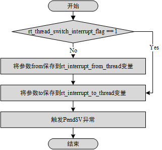 In the Cortex-M architecture, the function implementation flow of rt_hw_context_switch_interrupt() is shown in the figure below. It will set the rt_interrupt_to_thread variable of the thread to be switched, and then trigger the PendSV exception (PendSV exception is specifically used to assist context switching and is initialized as the lowest priority exception). After the PendSV exception is triggered, the PendSV exception interrupt handler will not be executed immediately because the interrupt is still being processed. Only when the interrupt follow-up program is completed and the interrupt processing is actually exited, the PendSV exception interrupt handler will be entered.
