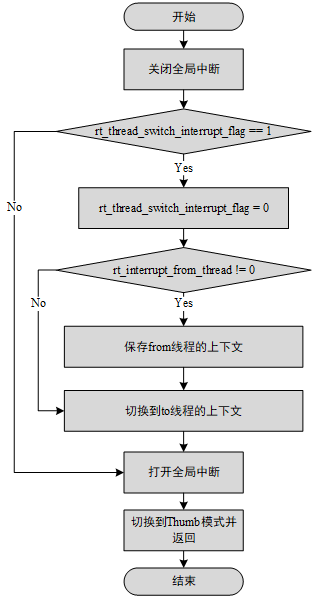 Another situation is that thread switching is required during interrupt handling. In this case, the rt_hw_context_switch_interrupt() function is called to perform context switching. This function is related to the CPU architecture, and the implementation methods of different CPU architectures are different.