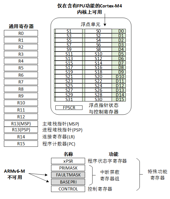 The register group of the Cortex-M series CPU includes 16 general register groups R0~R15 and several special function registers, as shown in the figure below.