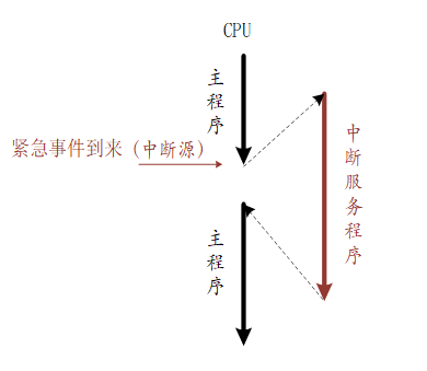 These scenarios are also common in embedded systems. When the CPU is processing internal data, an emergency occurs in the outside world, requiring the CPU to suspend the current work and handle this asynchronous event . After processing, it returns to the original interrupted address and continues the original work. This process is called an interrupt. The system that implements this function is called an interrupt system , and the source of the request for CPU interrupt is called an interrupt source . An interrupt is an exception. An exception is any event that causes the processor to deviate from normal operation and execute special code. If it is not handled in time, the system will fail at best, or even cause a devastating system paralysis. Therefore, correctly handling exceptions and avoiding errors is a very important part of improving software robustness (stability). The following figure is a simple interrupt diagram.