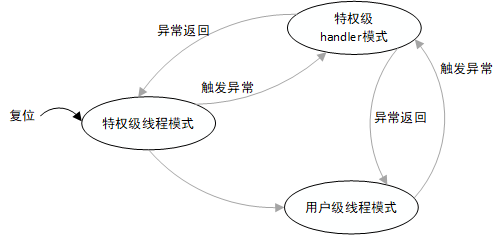 Cortex-M has two operating levels, privileged level and user level. The thread mode can work at the privileged level or user level, while the processing mode always works at the privileged level and can be controlled by the CONTROL special register. The working mode state switching is shown in the figure above.