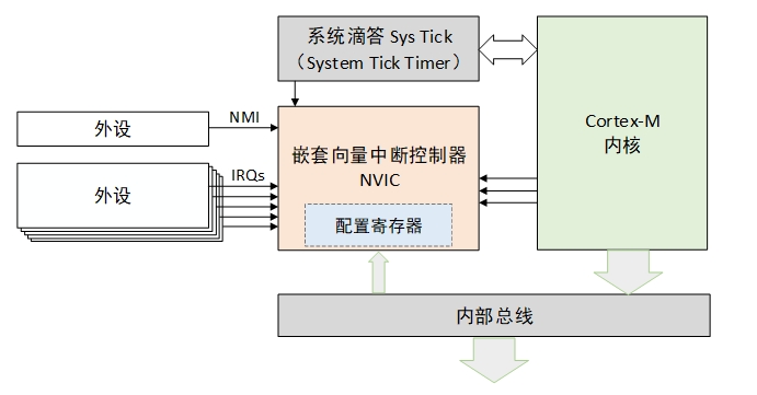 The Cortex-M interrupt controller is called NVIC (Nested Vectored Interrupt Controller), which supports interrupt nesting. When an interrupt is triggered and the system responds, the processor hardware automatically pushes the context registers of the current running location into the interrupt stack. This part of the registers includes PSR, PC, LR, R12, R3-R0 registers.