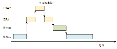 When interrupt nesting is allowed, during the execution of the interrupt service program, if a high-priority interrupt occurs, the execution of the current interrupt service program will be interrupted to execute the interrupt service program of the high-priority interrupt. When the high-priority interrupt is processed, the interrupted interrupt service program will continue to be executed. If thread scheduling is required, the thread context switch will occur when all interrupt handlers are finished running, as shown in the following figure.